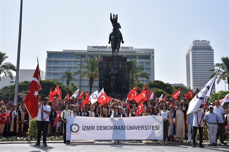 Rektör, Prof. Dr. Bedriye TUNÇSİPER’in liderliğinde üniversite öğretim üyelerinin ve idari personelinin ellerinde Türk Bayraklarıyla katılım gösterdiği “Demokrasi Yürüyüşü”, Alsancak Gündoğdu Meydanı’ndan, Cumhuriyet Meydanı’na kadar gerçekleştirildi. Cumhuriyet Meydanı’nda basın açıklaması yapan Rektör, Prof. Dr. Bedriye TUNÇSİPER, “Demokrasi Yürüyüşü” nün Türk akademisinin, demokrasiye olan inancı ve bağlılığının ifadesi olduğunu vurguladı.