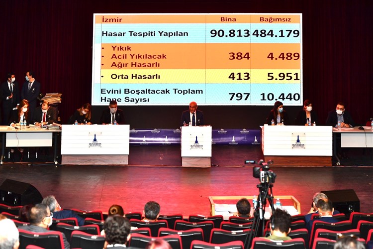 İzmir Büyükşehir Belediye Meclisi'nin Kasım ayı toplantısı birinci birleşimi İsmet İnönü Sanat Merkezi'nde depremde hayatını kaybeden 115 kişinin anısına bir dakikalık saygı duruşu ile başladı. İzmir Büyükşehir Belediye Başkanı Tunç Soyer, meclis üyelerine deprem sonrası yapılan çalışmalar hakkında bilgi verdi. Soyer, sadece evi yıkılmış ya da ya ağır hasar görenlere değil, orta hasarlı binalarda oturan ancak bugün oturamayacak durumda olanlara da destek verme kararı aldıklarını bildirerek, “Bir Kira Bir Yuva kampanyamız kapsamında bağışlar 30 milyona ulaştı. Belediye bütçesinden aktaracağımız 30 milyon lira ile birlikte bu rakamı 60 milyona çıkaracağız” dedi.